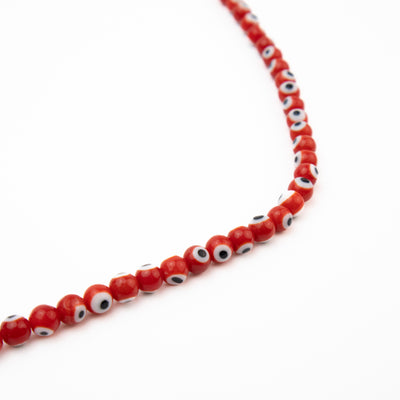 This 6.5mm glass evil eye features a vibrant red color and is strung on a 7.5 inch strand with a 1mm hole. Protect yourself from negative energy with this traditional talisman.