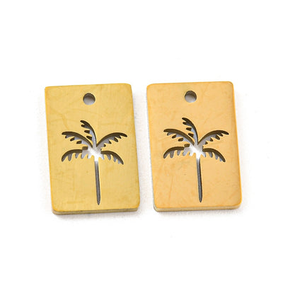 This gold rectangle charm is made of top-notch stainless steel and features a laser cut coconut tree design. The charm size is 11.8 x 8mm and has a threading hole that is 1mm wide. Each package contains 3 charms, perfect for adding a summer vibe and vacation mood to your accessories. Get inspired by the coconut tree and live the beach style with this quirky and fun charm.