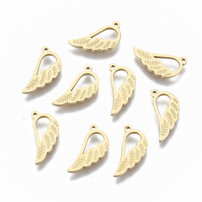 Add a touch of elegance with our 14k Gold Plated Stainless Steel Mini Wing Charm. The wing design adds a unique and sophisticated element to any accessory. Made from durable stainless steel, this mini charm measures 12mm x 5.5mm x 1mm and comes in a package of 1 piece. Elevate your style with this exclusive charm.
