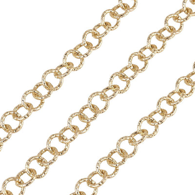This Aluminum Unwelded Textured Rolo Gold Chain Spool is a lightweight yet strong solution for a variety of projects. It features an unwelded textured rolo chain style with round links measuring 15.5mm x 2mm. The continuous 5 meter (16.4 feet) spool lets you easily cut the desired length for your project.