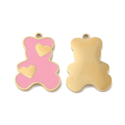 Elevate your jewelry game with our 18k gold plated stainless steel charm. Adorned with a delicate bear silhouettes in pink enamel, this piece exudes a luxurious and exclusive vibe. The charm's petite size of 17mm x 12.5mm x 1 mm thick adds a touch of elegance, making it the perfect addition to your collection. Package includes 1 piece.