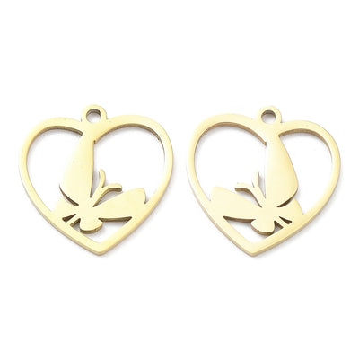 Indulge in elegance with our 18k Stainless Steel Heart with Butterfly Pendants. Crafted with a flat outline heart shape and an asymmetrical butterfly inside, these charms add a touch of sophistication to any outfit. With 2 charms per package and 18k gold plating, these limited quantities are available exclusively online.