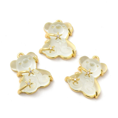 This pendant is 23.5x20.5x8mm in size, with a looping hole size of 1.5mm. It features an 18k or 14k gold plated design with a rhinestone, adorned with a charmingly transparent resin bear. It comes in both black (18k gold plated) and clear (14k gold plated) options and is sold in a package of 1. Get your hands on this fashionable pendant today!