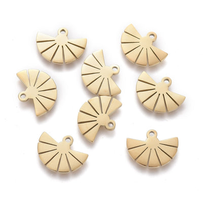 Elevate your style with our Stainless Steel Mini Fan Charm. Crafted with a minimalist design and ion plated stainless steel, this charm adds a touch of elegance to any ensemble. The intricate laser cut gold fan design is a statement piece that is both sophisticated and refined. Each package includes 1 charm, measuring at 7.5mm x 10mm x 0.8mm. Upgrade your look with this exclusive accessory.