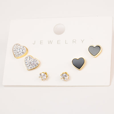 Get ready to rock and sparkle with these Stainless Steel Gold Earrings with Rhinestones (Assorted Shapes)! Made from top-notch stainless steel, they're only available in San Juan and online, so snag them while you can. Each package includes 3 rad stud styles with black and clear rhinestones in heart and round shapes. Don't miss out on these limited quantities - they're the perfect finishing touch for any outfit!