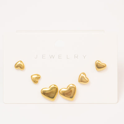 Stainless Steel Heart-Shaped Earrings in Gold will make you gleam with delight! Made of top-notch stainless steel, these beauties are only sold in San Juan and online stores. Grab them now while supplies last - each package contains 3 pairs in various sizes.