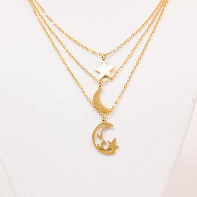 Equipped with triple layers of celestial charm, this Gold Stainless Steel necklace features a stunning Moon and Star design, all enhanced with a convenient extension for adjustable styling. One necklace per package - perfect for all your cosmic adventures!