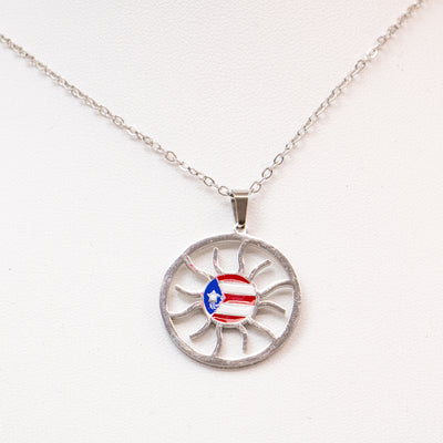 Showcase your love for Puerto Rico with our Stainless Steel Puerto Rican Flag Sun Pendant Chain Necklace. Made of high quality stainless steel and enamel, this pendant in the shape of a flaming sun features the Puerto Rican flag design. The 17.7 inch long necklace with an extension is perfect for everyday wear. Express your pride and passion with this stylish piece.