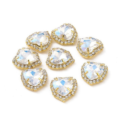 This set of 2 Brass Heart Sew-On Faceted Glass Multicolor Rhinestones features a brass setting with a size of 17x16x6mm. You can use them for sew-on applications or as multistrand connectors, with 4 holes in the back and a flat back structure. The rhinestones have a clear finish and a light golden tone.