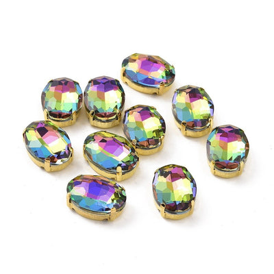 This set of 5 Stainless Steel Oval Sew-On Faceted Glass Multicolor Rhinestones features a stainless steel setting with a size of 18x13x7mm. You can use them for sew-on applications or as multistrand connectors, with 4 holes in the back and a flat back structure. The rhinestones have a multicolor hue finish and a light golden tone.
