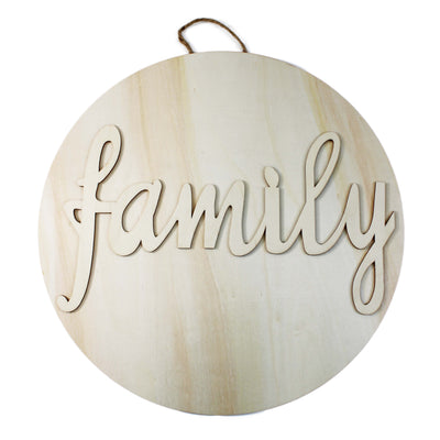 Round wood plaque of 14 inch diameter for home décor with embossed word "Family" and jute rope in the back for wall hanging. Sign in made from unfinished natural wood with smooth and strong solid surfaces that can be easily stain, paint, draw, glue or varnish.
