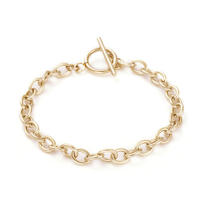 The Stainless Steel Toggle Bracelet comes in gold and silver and measures approximately 5mm by 7-5/8 inches (19.4cm). Made of 304 stainless steel, this durable bracelet features large chain links, perfect for adding charms, and a unique toggle clasp for easy wear.