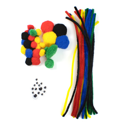 This 64-piece Pom Pom, Chenille & Wiggle Eye Set brings a bright multicolor medley to craft projects. Assorted sizes, colors, and shapes, including 12” long chenille, basic tones of red blue yellow green and black pom poms, and googly eyes make it an excellent choice for school, camp, and home-based projects.