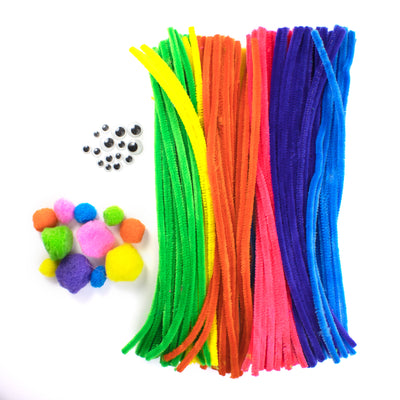 This 300-piece Pom Pom, Chenille & Wiggle Eye Set brings a neon multicolor medley to craft projects. Assorted sizes, colors, and shapes, including 12” long chenille, bright tones of funky pink, light and royal blue, yellow, neon green and purple of regular pom poms, and googly eyes make it an excellent choice for school, camp, and home-based projects.