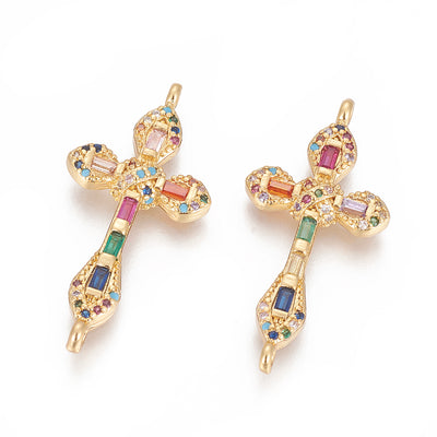 Experience a burst of color with our 18k Gold Plated Cubic Zirconia Cross Connector! This playful piece features a unique design with cubic zirconia and micro pave stones, and has a convenient hole size of 1.2mm. Perfect for adding some personality to your jewelry making, this connector measures 32.5x15.5x3.5mm and comes in a package of 1. Grab one now while supplies last, exclusively at our San Juan and online stores!