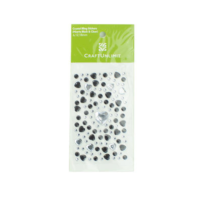 These Crystal Bling Stickers provide a rhinestone-style aesthetic with round and heart shaped clear and black stones ranging in size from 3mm to 18mm. Perfect for a variety of make-up designs and craft projects, each bag contains 1 sheet.