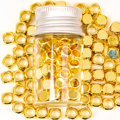 Enhance your jewelry making with our 18k Gold Plated 5mm Cubic Spacer. These spacers boast a sleek finish and provide a touch of sophistication to any creation. Incorporate them in bracelets, necklaces, earrings, and more to make a statement with your style. Each size contains 40 beads that come in a reusable glass bottle for ease. The inner hole has a 4mm diameter, making it ideal for wide thread or chain projects.