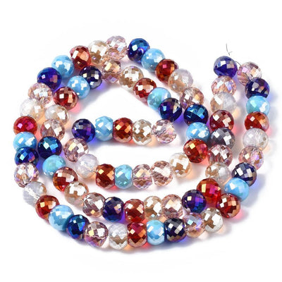 This 18.50-inch strand features 8x6mm electroplated glass faceted beads with an AB color plating, offering a vibrant, iridescent finish. Each bead has a 1.4mm hole, ideal for precise stringing in detailed jewelry designs. Perfect for expert crafters seeking high-quality components to enhance their creations with durable, eye-catching elements.