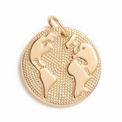 Say "hello" to the Stainless Steel Gold Earth Globe Pendant, perfect for travel lovers and everyday wear. With a 21x2mm dimension and a coin-like shape, this pendant is sure to turn heads. Featuring a playful ion plating finish and made from 304 high quality stainless steel, it's both durable and stylish. And don't worry, the 7x1mm jump ring makes it easy to accessorize with any chain of your choice. Go ahead, add this quirky and fun pendant to your jewelry collection today!