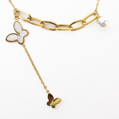 Get ready to flutter with this Stainless Steel Butterfly Pearl Necklace! With an 18 inch chain and delicate design, this necklace comes in gold and is perfect for adding a touch of fashion to any outfit. And don't worry, it's not just one butterfly - you get a whole necklace full of fluttering fun!