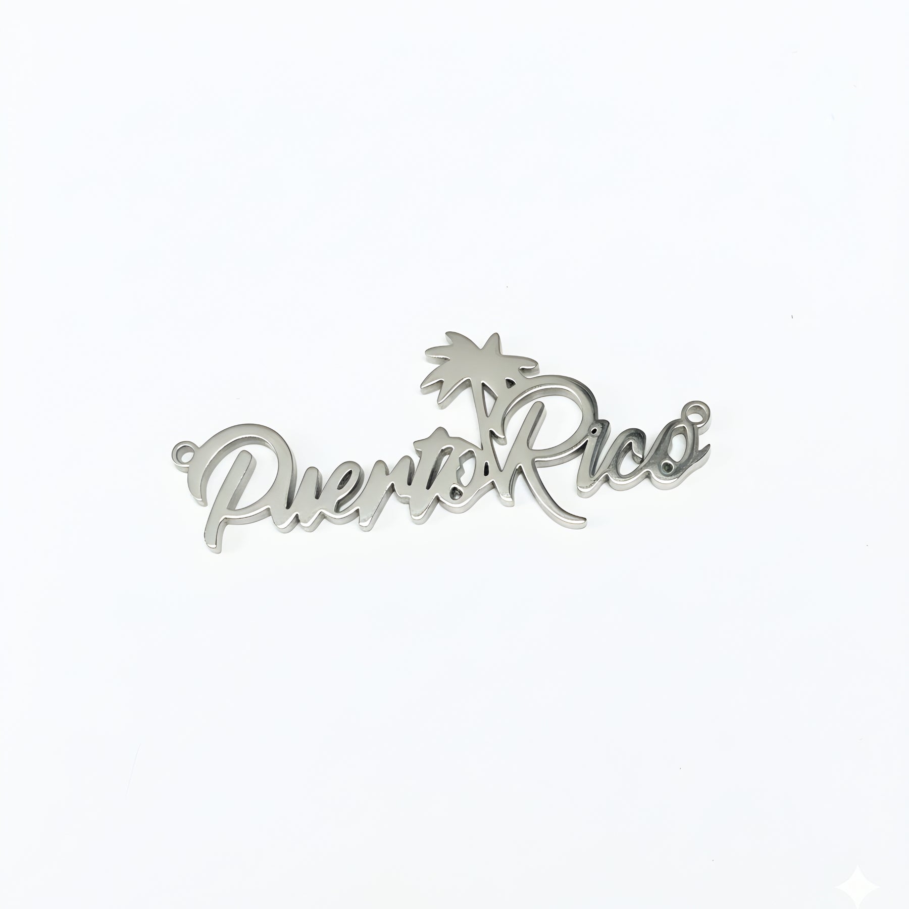 Crafted from durable stainless steel, this 40mm accessory features the word "Puerto Rico" elegantly linked by a charming palm tree connector. Its sleek design embodies island spirit, making it a timeless piece that adds a subtle yet meaningful touch to any outfit or collection. Perfect for those who cherish Puerto Rican pride or seek a stylish reminder of tropical roots.