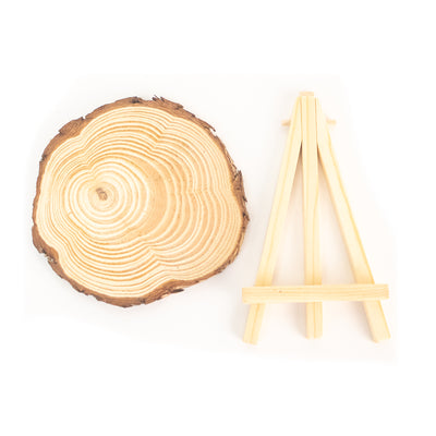 Unfinished Round Shaped Wood Slice with bark for sign decorations, painting, DIY Crafts Christmas & Wedding Ornaments. Slab plaque comes with 6inch tall unfinished easel for easy display. Wood slab measures 4.75 inches approximate, slight changes in texture, color, shape and sizes may occur as this is a natural item,