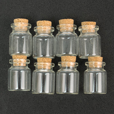 This mini bottle set comes with 8 pieces, each with a diameter of 2.2cm (or roughly 1 inch). The bottles are made of clear glass and topped with a cork, perfect for holding 4 ml of liquid.