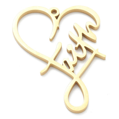 Make a statement with this beautiful, stainless steel gold heart pendant featuring an elegant, cursive word design. The heart-shaped pendant is 38x29x2mm in size with a 1.8mm hole, making for a timeless piece of jewelry sure to stay in your collection for years to come.